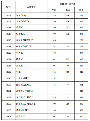 2023年1月广东省城市轨道交通工程劳务市场用工价格信息