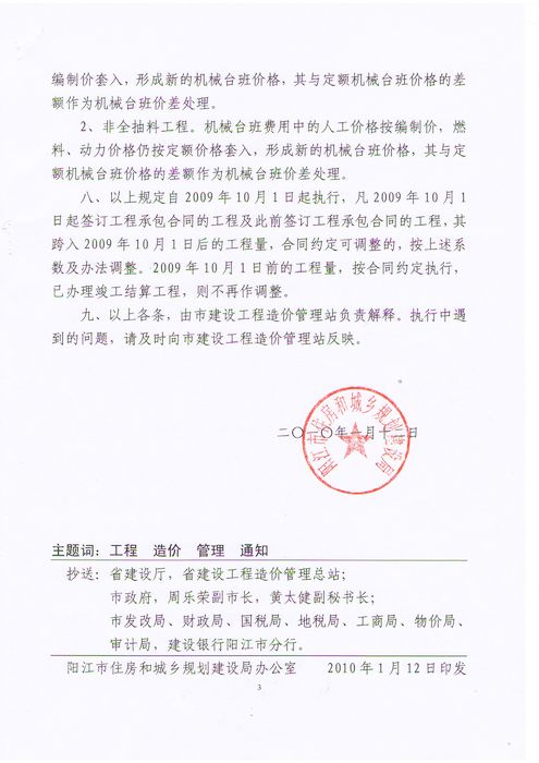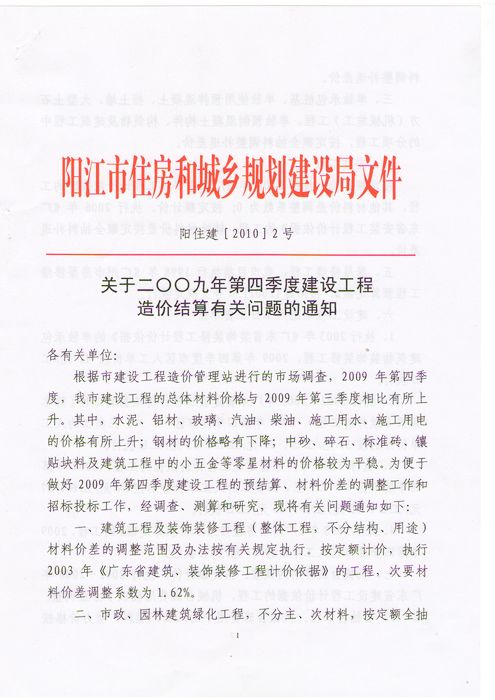 阳江市住房和城乡规划建设局关于二〇〇九年第四季度建设工程造价结算有关问题的通知(阳住建[2010]2号)