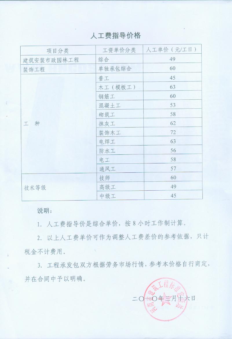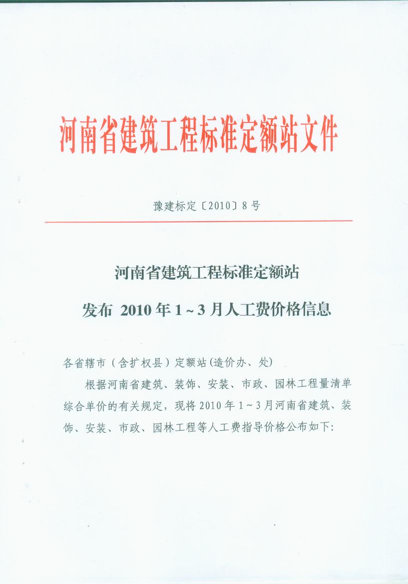 河南省建筑工程标准定额站发布2010年1-3月人工费价格信息